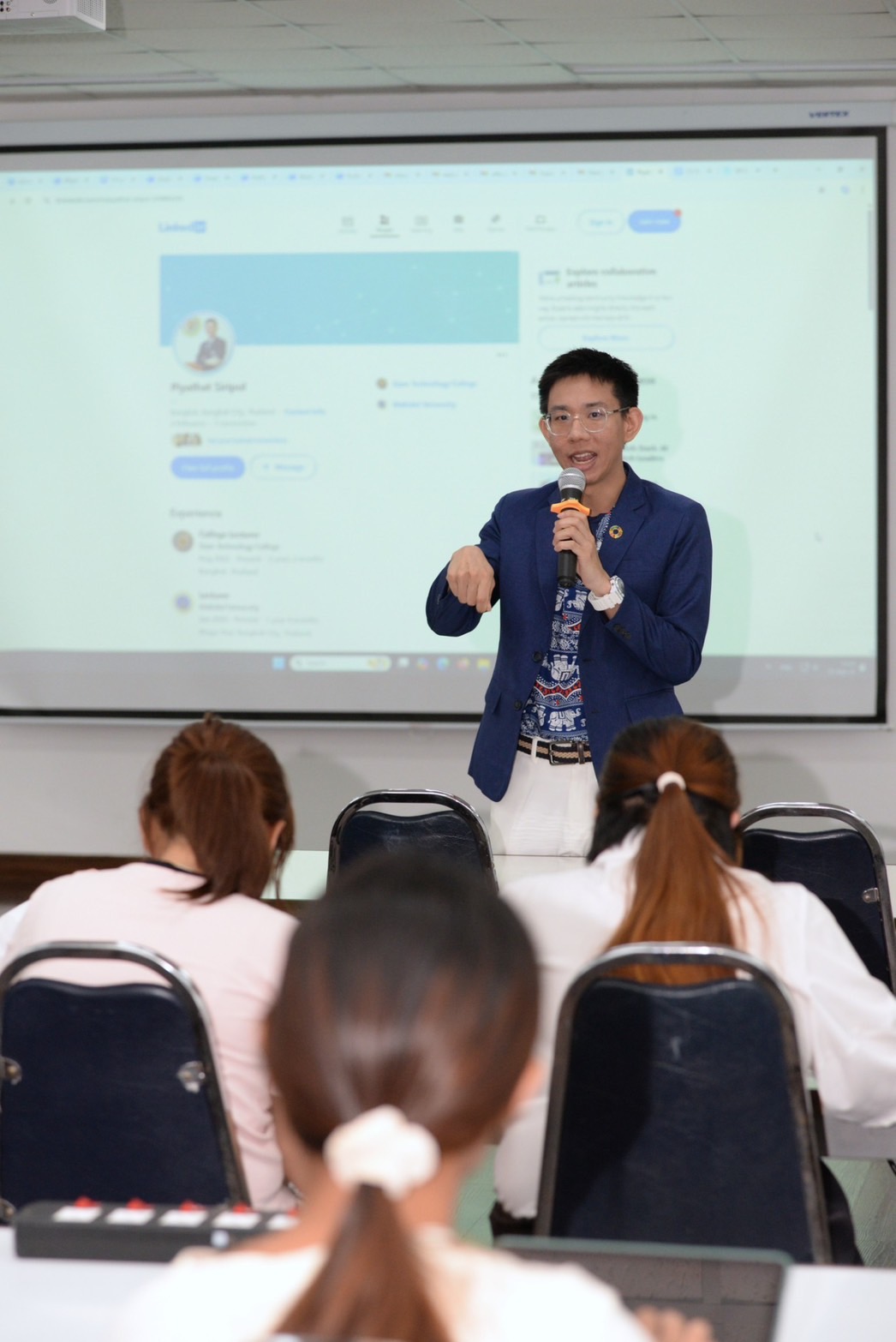 กิจกรรมในครั้งนี้ได้รับเกียรติจาก อาจารย์ปิยทัศน์ ศิริพล อาจารย์ประจำสาขาการสอนภาษาอังกฤษสำหรับผู้พูดภาษาต่างชาติ (TESOL) คณะศึกษาศาสตร์ วิทยาลัยเทคโนโลยีสยาม และ อาจารย์วรวิธ เสนีชัย อาจารย์ประจำสาขาวิชาภาษา คณะศิลปศาสตร์ มจธ. ร่วมเป็นวิทยากร ถ่ายทอดความรู้และเทคนิคการเขียน CV ที่โดดเด่นและดึงดูดความสนใจของ HR รวมถึงการใช้ AI เป็นผู้ช่วยในการออกแบบ จัดรูปแบบ และปรับปรุงเนื้อหาให้น่าสนใจ ตลอดจนเคล็ดลับการพัฒนา LinkedIn Profile ให้โดนใจนายจ้างในระดับสากล