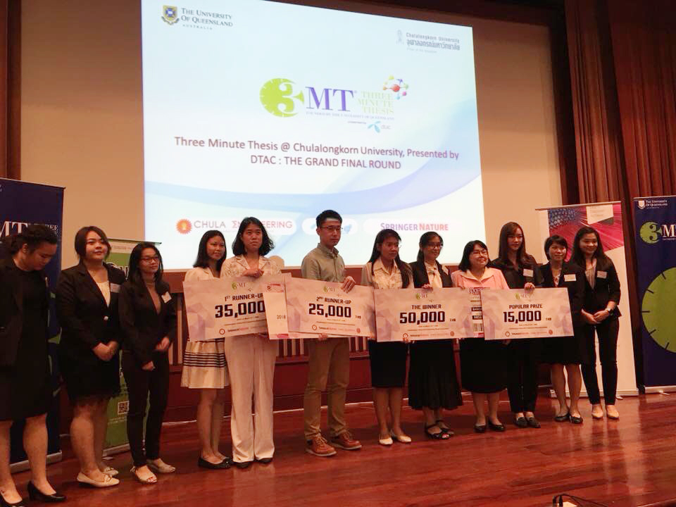 เมื่อวันศุกร์ที่ 23 มีนาคม 2561 Mr. HAI LIN นักศึกษาคณะศิลปศาสตร์ หลักสูตรปรัชญาดุษฎีบัณฑิต สาขาวิชาภาษาศาสตร์ประยุกต์ (หลักสูตรนานาชาติ) ได้รับรางวัลรองชนะเลิศอันดับที่ 2 ในการแข่งขันนำเสนอผลงาน Three Minute Thesis ที่คณะวิศวกรรมศาสตร์ จุฬาลงกรณ์มหาวิทยาลัย จัดการแข่งขันโดย DTAC และ ชมรมบัณฑิตศึกษาคณะวิศวกรรมศาสตร์ จุฬาลงกรณ์มหาวิทยาลัย ซึ่ง Mr. HAI LIN ได้เป็นตัวแทนของประเทศไปประกวดระดับโลก ณ The University of Queensland (UQ) ประเทศออสเตรเลีย โดยมีอาจารย์ที่ปรึกษา คือ ผศ.ดร. วรรณภา ตระกูลเกษมสุข จากสายวิชาภาษา คณะศิลปศาสตร์ มจธ. และ ผศ.ดร.ปัทมวรรณ จิมากร ซิลลิ คณะศิลปศาสตร์ มหาวิทยาลัยธรรมศาสตร์
