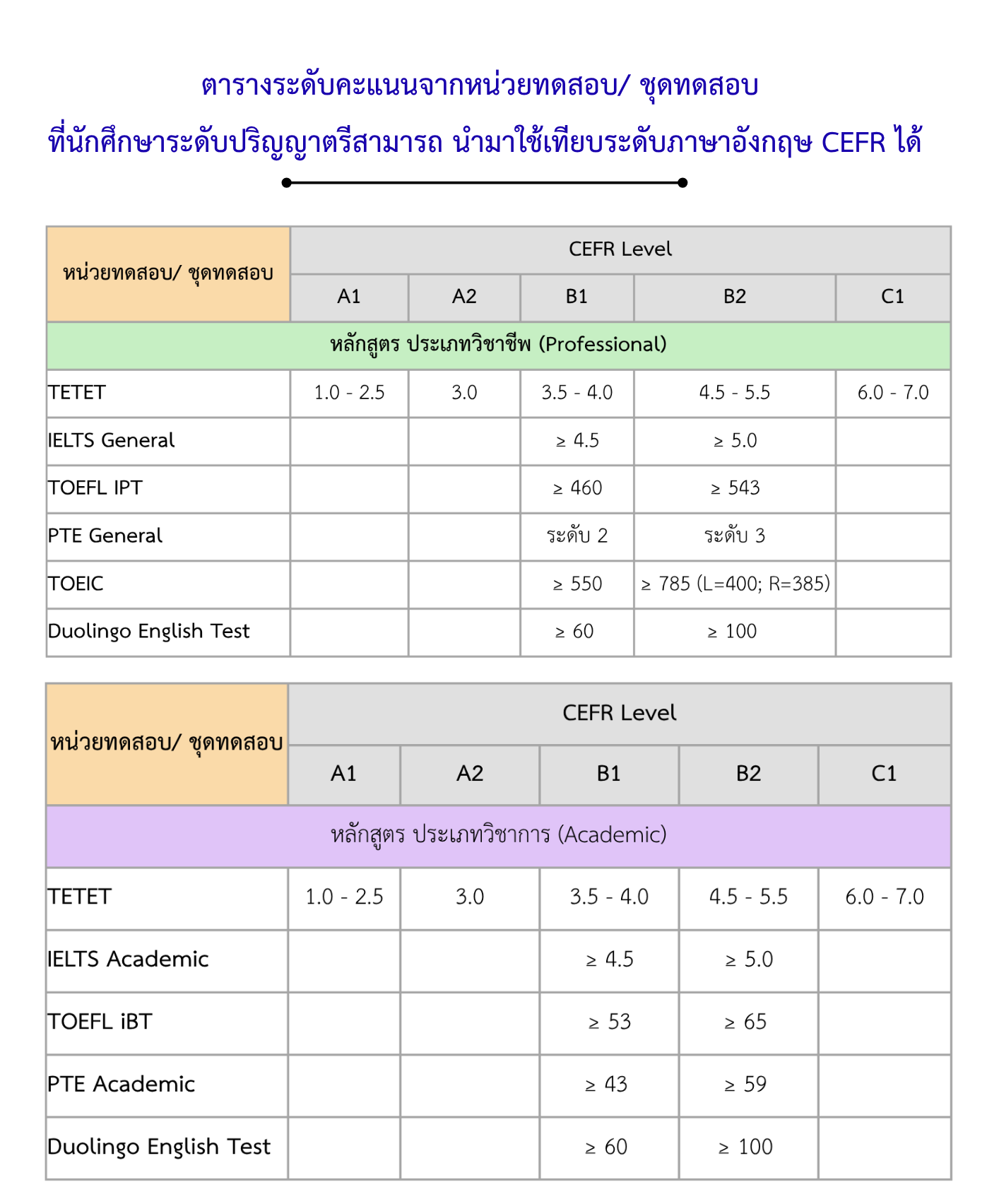 เกณ์การยื่นผลคะแนนเพื่อเทียบระดับภาษาอังกฤษ สำหรับ หลักสูตรใหม่และหลักสูตรปรับปรุง 16 หลักสูตร เท่านั้น