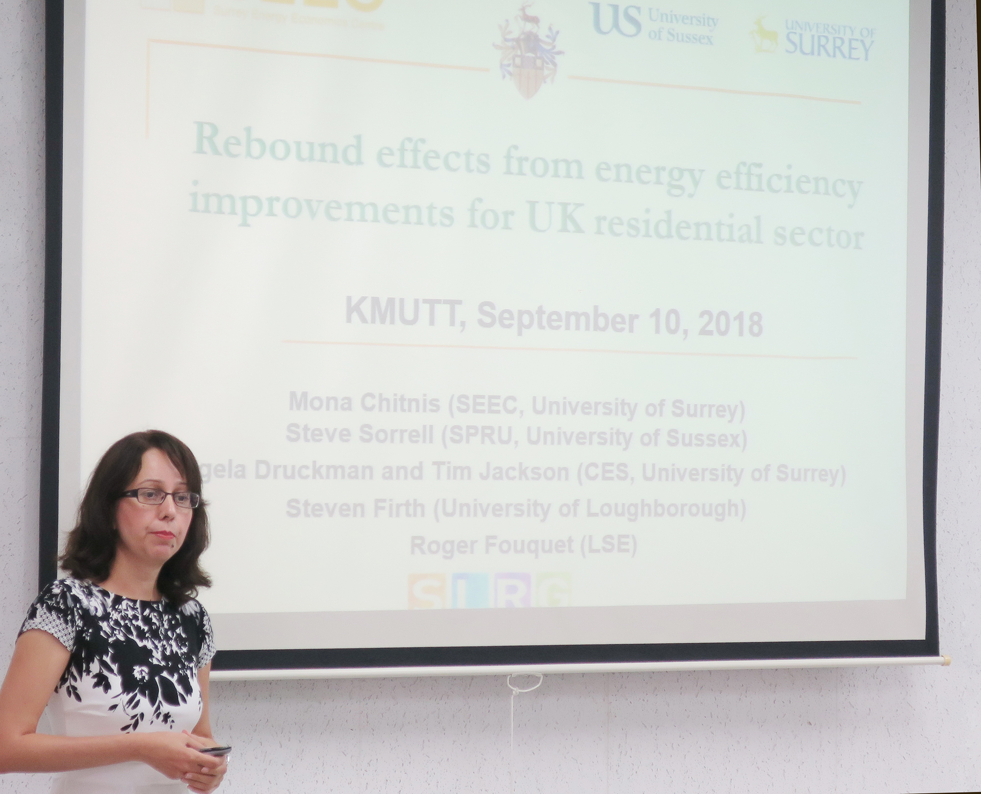 สายวิชาสังคมศาสตร์และมนุษยศาสตร์ คณะศิลปศาสตร์ จัดกิจกรรม Special Lunch Talk with Dr. Mona Chitnis ในหัวข้อ “Rebound effects from energy efficiency improvements for UK residential sector” เมื่อวันจันทร์ที่ 10 กันยายน 2561 ที่ผ่านมา ณ ห้อง SoLA 906 ชั้น 9 คณะศิลปศาสตร์ มหาวิทยาลัยเทคโนโลยีพระจอมเกล้าธนบุรี กิจกรรมดังกล่าวได้รับความสนใจจากบุคลากรบัณฑิตวิทยาลัยร่วมด้านพลังงานและสิ่งแวดล้อม คณะครุศาสตร์อุตสาหกรรมและเทคโนโลยี และสำนักบริหารอาคารและสถานที่ และนักศึกษาระดับบัณฑิตศึกษาบัณฑิตวิทยาลัยร่วมด้านพลังงานและสิ่งแวดล้อม และคณะพลังงานสิ่งแวดล้อมและวัสดุ รวมจำนวนทั้งสิ้น 14 คน