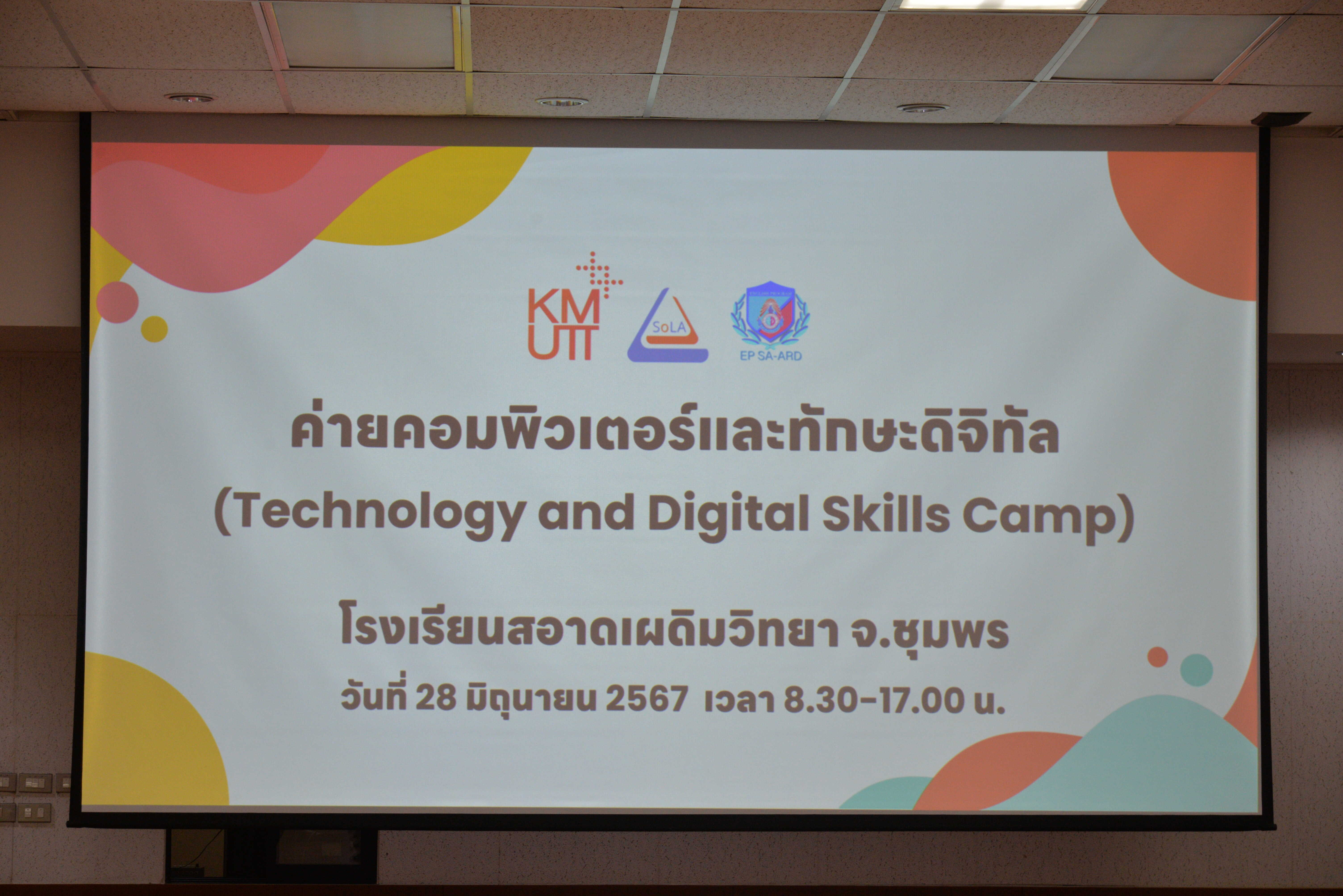 คณะศิลปศาสตร์ มหาวิทยาลัยเทคโนโลยีพระจอมเกล้าธนบุรี โดยศูนย์พัฒนาสมรรถนะสากล (GCDC) ร่วมกับกลุ่มวิชาภาษา จัดกิจกรรมค่ายทักษะคอมพิวเตอร์และทักษะดิจิทัล (Technology and Digital Skills Camp) ให้กับนักเรียนชั้นมัธยมศึกษาปีที่ 5 โรงเรียนสอาดเผดิมวิทยา จังหวัดชุมพร โดยมี รศ.ดร.อธิปัตย์ บุญเหมาะ อาจารย์ประจำคณะศิลปศาสตร์ เป็นผู้รับผิดชอบโครงการ กิจกรรมนี้จัดขึ้นในวันที่ 28 มิถุนายน 2567 ได้รับเกียรติจาก ผศ.ดร.ศศิธร สุวรรณเทพ คณบดีคณะศิลปศาสตร์ และผู้บริหารคณะศิลปศาสตร์ให้การต้อนรับ จากนั้น นักเรียนได้เข้าอบรมเชิงปฏิบัติการการประยุกต์ใช้เทคโนโลยีในการออกแบบสื่ออย่างสร้างสรรค์ โดย หน่วยเทคโนโลยีการเรียนรู้ คณะศิลปศาสตร์ เยี่ยมชมคณะเทคโนโลยีสารสนเทศ (School of Information Technology: SIT) แลกเปลี่ยนเรียนรู้กับนักศึกษาของคณะฯ เกี่ยวกับการเรียนและการใช้ชีวิตในรั้วมหาวิทยาลัย เยี่ยมชมสถาบันวิทยาการหุ่นยนต์ภาคสนาม (Institute of Field Robotics: FIBO) เปิดประสบการณ์การประยุกต์ใช้ AI ในนวัตกรรมหุ่นยนต์ จากฐานการเรียนรู้ 4 ฐาน ได้แก่ 1) ฐาน AR (Augmented Reality) การนำเทคโนโลยีมาผสานระหว่างโลกแห่งความเป็นจริงและโลกเสมือนจริง 2) ฐาน Smart Factory เรียนรู้การควบคุมเครื่องจักรในโรงงานอัจฉริยะผ่านการควบคุมระยะไกล 3) ฐาน Interactive Aquarium ชมสัตว์ทะเล 3 มิติเคลื่อนไหวอย่างมีชีวิตบน Interactive Virtual Aquarium และ 4) ฐานหุ่นยนต์แขนกล เรียนรู้การควบคุมการทำงานของระบบหุ่นยนต์หรือแขนกลเบื้องต้น นอกจากนี้ ได้รับฟังข้อมูลการศึกษาแขนงต่างๆ และสาขาวิชาที่ มจธ. เปิดสอน และการเตรียมความพร้อมในการเข้าศึกษาต่อในระดับอุดมศึกษา โดยสำนักงานคัดเลือก และสรรหานักศึกษา การจัดกิจกรรมค่ายครั้งนี้ เป็นการส่งเสริมให้นักเรียนได้เปิดประสบการณ์การเรียนรู้นอกห้องเรียน สร้างความตระหนักในการพัฒนาตนเองด้านทักษะดิจิทัล การเตรียมความพร้อม และวางแผนการศึกษาต่อในระดับอุดมศึกษาต่อไป โดยมีคณะครู และนักเรียนเข้าร่วมกิจกรรมทั้งสิ้น 31 คน