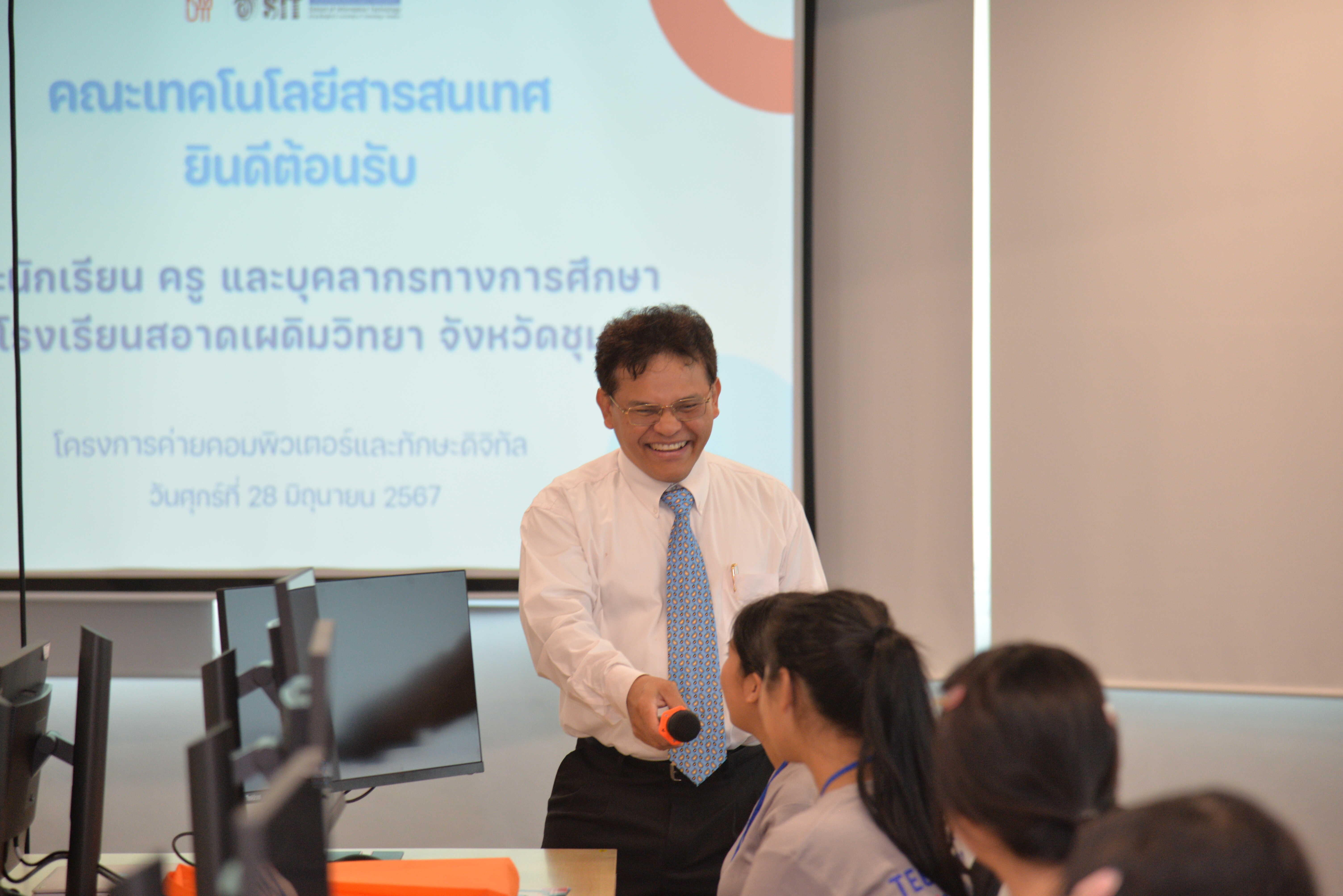 School of Liberal Arts, King Mongkut’s University of Technology Thonburi, and the Global Competency Development Center (GCDC) in collaboration with the Language Studies Group, the School of Liberal Arts at King Mongkut’s University of Technology Thonburi organized a Computer Skills Camp and Digital Skills Camp for Mathayom 5 students from Saard Phaderm Wittaya School, Chumphon Province. The project was overseen by Assoc. Prof. Dr. Atipat Boonmoh, a lecturer at the School of Liberal Arts. This activity took place on June 28, 2024, and was graced by the presence of Asst. Prof. Dr. Sasitorn Suwannathep, Dean of the School of Liberal Arts, along with other administrators. Following the welcome, students participated in a workshop on the application of technology in creative media design, led by the Learning Technology Unit of the School of Liberal Arts. They then visited the School of Information Technology (SIT) to exchange knowledge with students about studying and campus life.